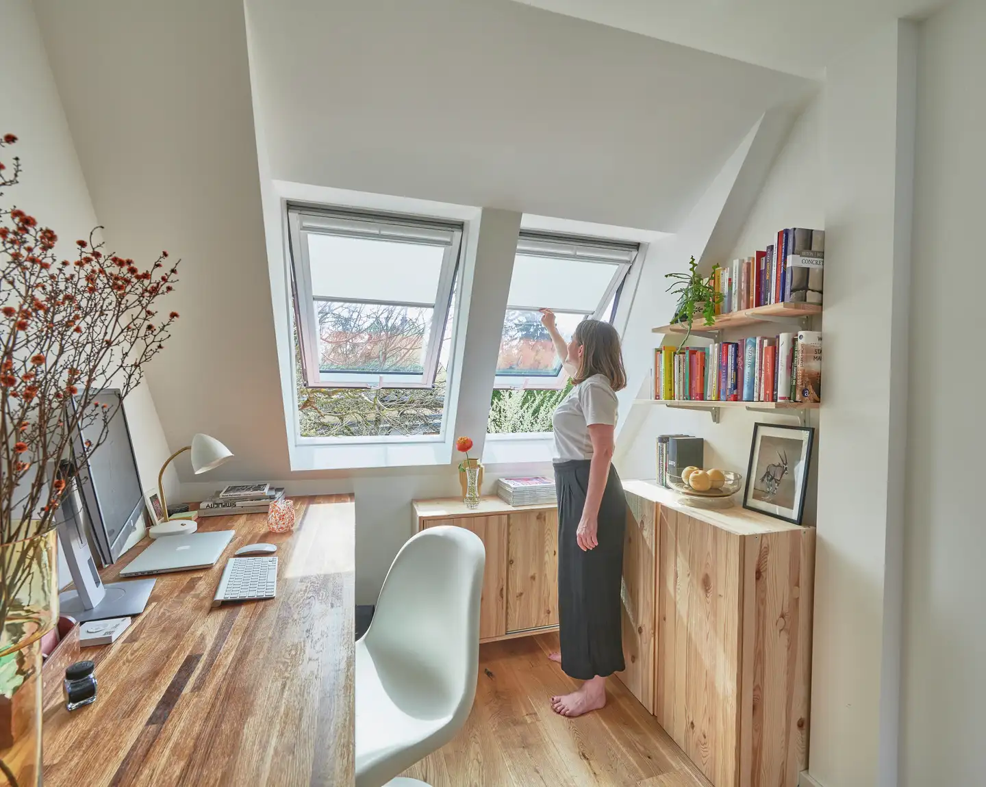 - Wprowadzenie do domowego biura takich elementów jak okna dachowe przez które wpada światło dzienne i odpowiednia wentylacja, może znacznie zwiększyć koncentrację, produktywność i samopoczucie.